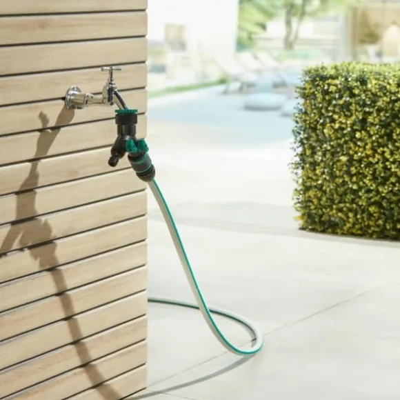 Vattenfördelaren gör det möjligt att arbeta med två slangar samtidigt. Med den kan du reglera eller stänga av vattenflödet separat för varje anslutning. Därför behöver du inte längre byta ut slangar vid kranen.