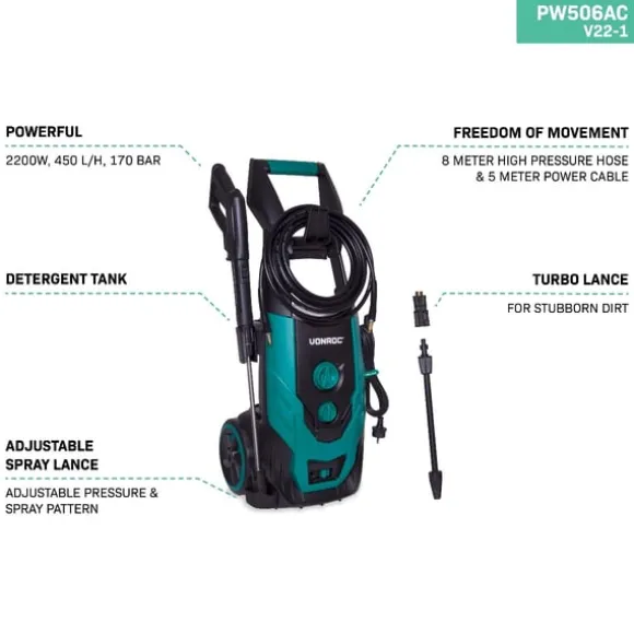 VONROC har ett brett utbud av högtryckstvättar. Letar du efter en mer omfattande 2200W modell, alltså med fler tillbehör? Det är möjligt, kolla in vår: