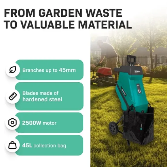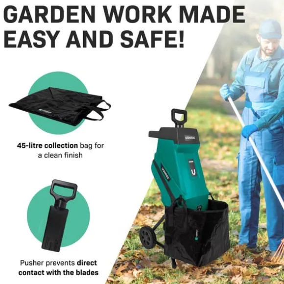 Med den här kompostkvarnen 2500W från VONROC kan du snabbt och effektivt minska trädgådsavfallet efter beskärning av häckar och träd. Kvarnen är lämplig för grenar upp till Ø45mm och är speciellt utformaf för små till medelstora trädgårdar. Tack vare den medföljande tryckpinnen så trycker du grenarna säkert genom kvarnen och dina händer är skyddade mot knivarna. Der strimlade avfallet samlas upp i den medföljande uppsamlingspåsen på 45 liter. Avfallet kan användas direkt som marktäckare eller som lätt komposterbart material.