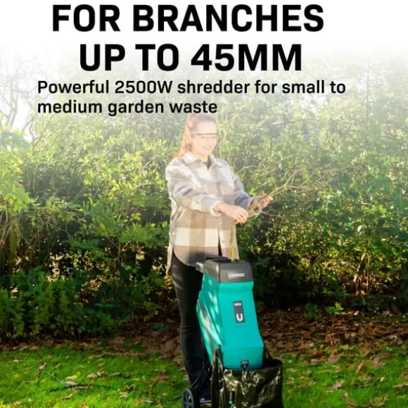 - Den kraftfulla 2500W motorn är lämplig för att strimla grenar upp till Ø45mm
