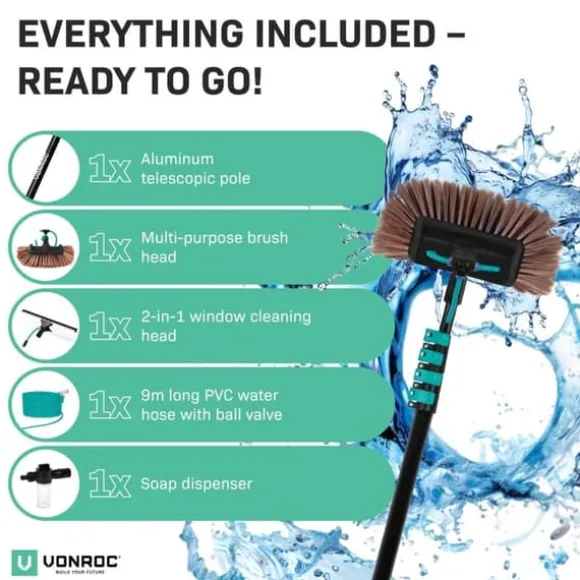 VONROC strävar alltid efter maximal bekvämlighet. Det är därför stången kan förlängas steglöst mellan 1,60m och 6,50m med hjälp av superenkla stängningsklämmor. (Tips: för att maximera stabiliteten, se till att utöka varje del proportionellt). Vi har täckt robusthet och hållbarhet också. Borsthuvuderna är fastsatta med starka gängor till skillnad från andra modeller som använder sårbara vridbara huvuden som är benägna att gå sönder. För att ge ett fast och bekvämt grepp är handtaget utrustat med Soft-grip.