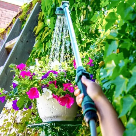Spraya dina växter, dig själv eller varandra med den här multifunktionella spraylansen. Med tre olika sprayinställningar, en lång stång och ett 180° justerbart huvud har du alltid rätt vattenflöde för din önskade aktivitet. Det är det perfekta tillägget till din bevattningsutrustning. En bra lösning för (högt) hängande växter, en uppfriskande trädgårdsdusch…och ett måste för vattenglädje under varmare dagar!