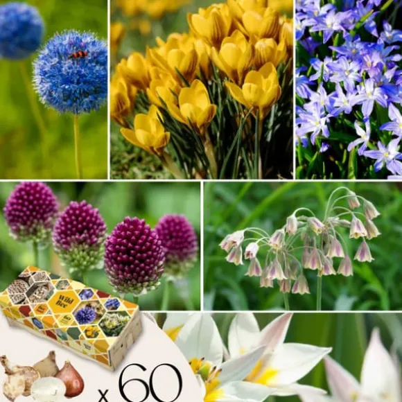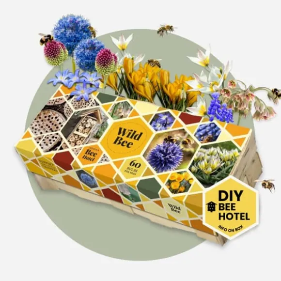 Lökarna i denna låda är vinterhärdiga och lätta att sköta. Plantera dem mellan september och december i väldränerad jord på en solig eller halvskuggig plats. Ytterligare vattning behövs endast vid långvarig torka. Låt bladen vissna helt efter blomningen så att lökarna kan lagra energi inför nästa säsong. Du kan lämna lökarna i jorden — de blommar igen varje år och ger näring åt bin och fjärilar under hela säsongen. Bihotellet hängs enkelt upp på en torr, solig plats (helst mot söder) på en höjd av 1–2 meter. Se till att öppningarna förblir fria och att hotellet inte blir blött underifrån. På så sätt skapar du en säker boplats för vildbin som kommer att återvända till din trädgård år efter år.