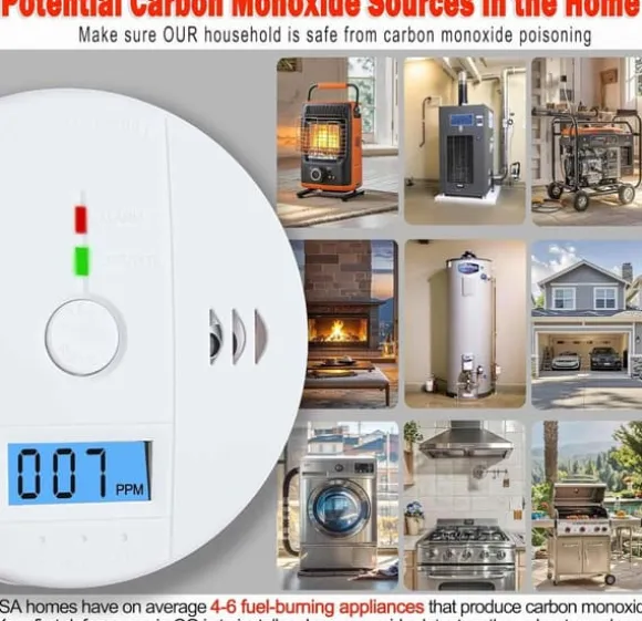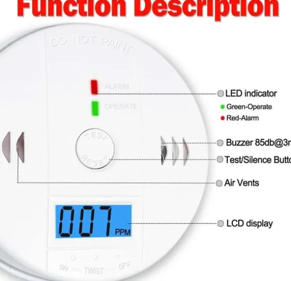 Omedelbar varning: När kolmonoxiddetektorn når larmnivån detekterar CO-sensorn CO, den röda lysdioden blinkar och LCD-skärmens blå bakgrundsbelysning tänds, vilket ger ett högt 85 dB-larm för tidig varning.