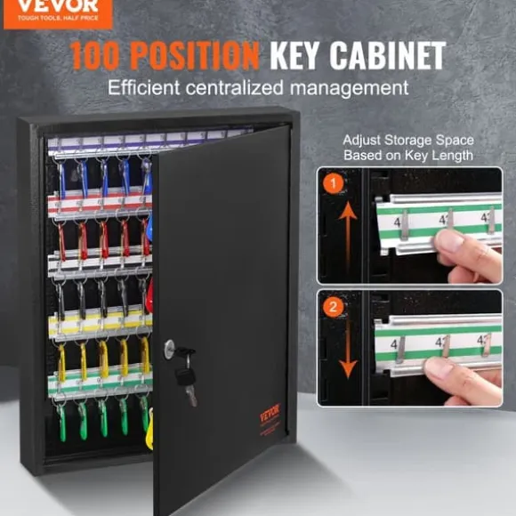 Med en kapacitet på 100 nycklar är detta nyckelskåp perfekt för central nyckelhantering. Krokarna kan justeras uppåt och nedåt, vilket gör att nycklar av olika längder enkelt kan förvaras och kategoriseras.