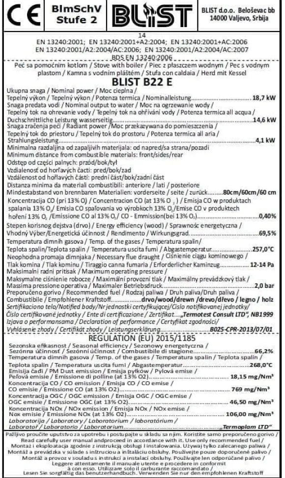 Bränsletyp: rekommenderas säsongsbetonad hårdved med fukthalt ≤ 20%, vedbriketter; kol endast som ett 10% tillsats