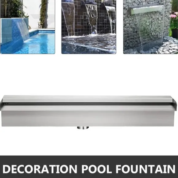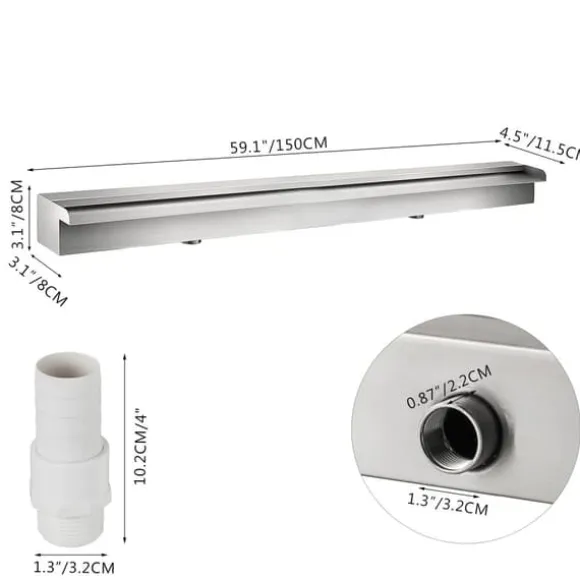 -Poolfontänens mått: Poolvattenfallsfontänens mått: 59,1 tum x 4,5 tum x 3,1 tum. Vatteninloppsdiameter: 1,3 tum. Vattenflödesbredd: 59,1 tum. Det kan lägga till dekoration till din trädgård, uteplats, damm eller pool, vilket gör den mer elegant, snygg och vacker.
