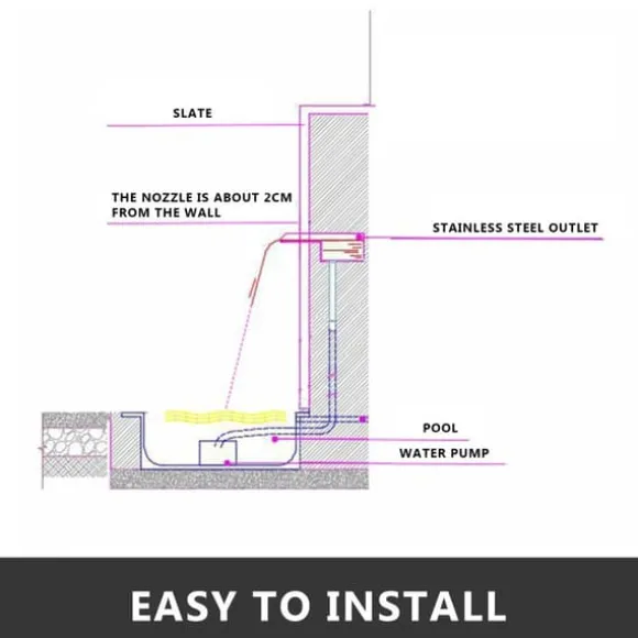Poolvattenfallet är kompatibelt med många pumpar, dränkbara pumpar, tryckfilter eller flödesfilter på marknaden. Du kan installera den på en stenmur, gabionvägg eller damm.