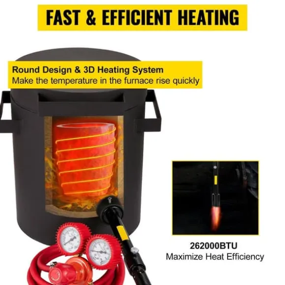 En enkel brännare med 76,8 kW/h och en justerbar propanregulator ökar ugnens uppvärmningseffektivitet. Dessutom har denna propankamin för smältning av metaller en rund design och ett 3D-värmesystem. Därför kommer det effektivt att minska din väntetid.