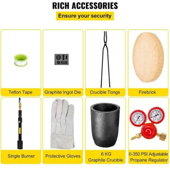 -Komplett smältsats: I denna propansmältugnssats ingår allt du behöver: propanugn, brännare, 6 kg degel, grafitgötform, 0-350 psi justerbar propanregulator, degeltång, eldfasta tegelstenar, skyddshandskar, 8,2 ft luftslangar och teflontejp. Det är perfekt för alla, även nybörjare.