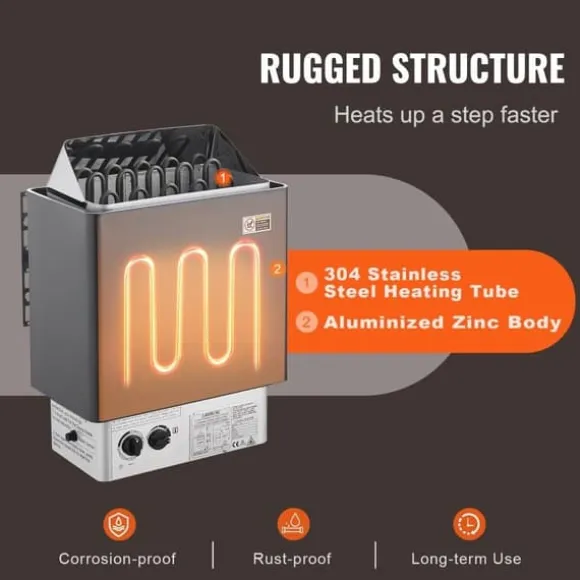 Denna bastuugn har ett aluminiserat zinkskal och värmeelement av 304 rostfritt stål för att motstå korrosion och ge jämn, snabb värmefördelning. Konstruerad för att fungera optimalt även i fuktiga miljöer.