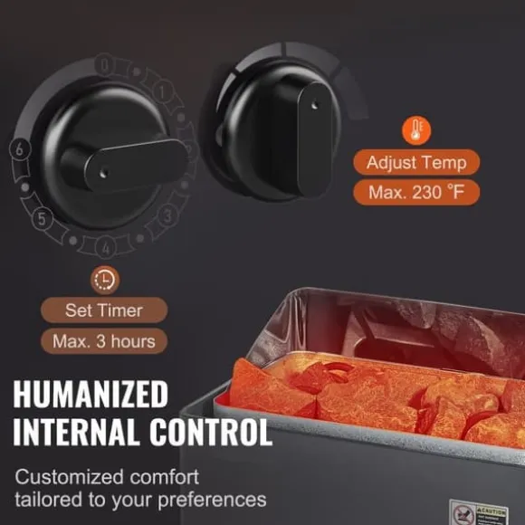 Med användarvänliga mekaniska rattar kan temperaturen justeras upp till 230℉ och tiden upp till 3 timmar. Anpassa bastuupplevelsen efter dina önskemål och njut av komforten med denna hembastuugn.