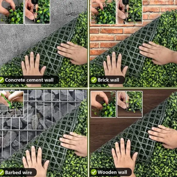 -Lätt att installera: De sex sammankopplade kontakterna kan förankras ordentligt, eller så kan du enkelt ansluta buxbomväggpanelen till valfri träram eller länkstängsel. Produkten kommer med 100 dragkedjor, så att du enkelt kan fästa panelen var som helst.