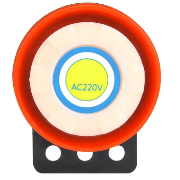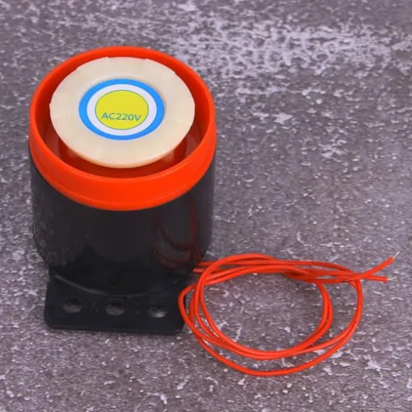 Denna artikel är en aktiv summer med högt decibelljud för ett larm. Den drivs med en 220V AC-strömförsörjning och avger ett ljud när den slås på. Den har en röd tråd som pluspol och en svart tråd som minuspol. Summern kan arbeta kontinuerligt i upp till 12 timmar. Den kan användas i brandkatastroflarm.