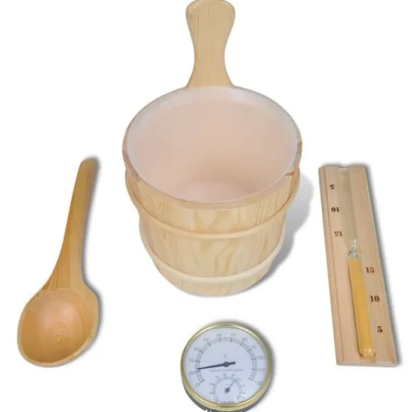 Bastutillbehören omfattar en hink, ett inlägg i plast för hinken, en slev, ett timglas och en termo-/hygrometer, vilka är ett måste för varje bastu.