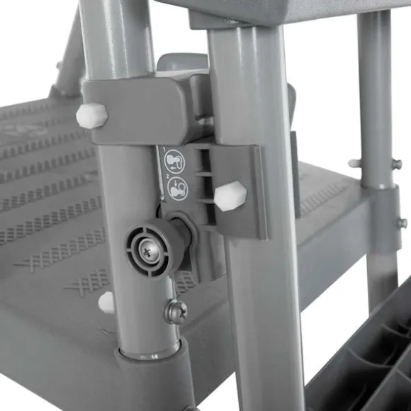 Filterpumpen är en del av cirkulationssystemet för att hålla vattnet rent. Filterpatronen hjälper till att hindra alger, mögel och andra mikrobiella bakterier från att växa i din pool. ChemConnect-dispensern upprätthåller och ger rent, friskt poolvatten. Poolstegen hjälper dig att komma i och ut ur poolen säkert. Trappstegen på ena sidan av stegen kan flyttas upp, vilket hjälper till att förhindra små barn från att klättra på stegen för att komma i poolen. Denna pool är lätt att vika ihop för förvaring och transport när den inte används.