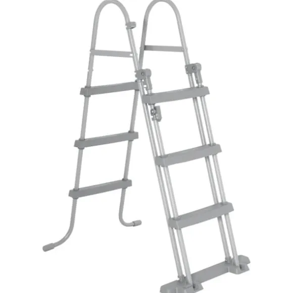 - Säker design: Poolstegen hjälper dig att ta dig ner och upp ur poolen på ett säkert sätt. Trappstegen på ena sidan av stegen kan flyttas upp så att små barn inte kan klättra på stegen för att komma i poolen.