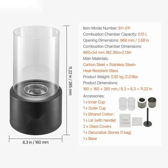 Denna bordseldplats mäter 6,30 tum (L) x 6,30 tum (B) x 11,22 tum (H) och väger endast 2,03 lbs (0,92 kg), vilket gör den enkel att bära och perfekt för utomhusbruk.