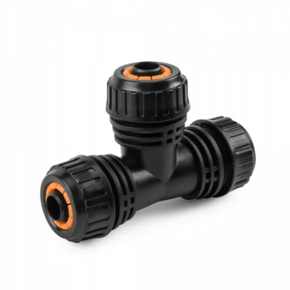 - T-kopplingen möjliggör snabb och enkel anslutning av tre 1/2″ trädgårdsslangar