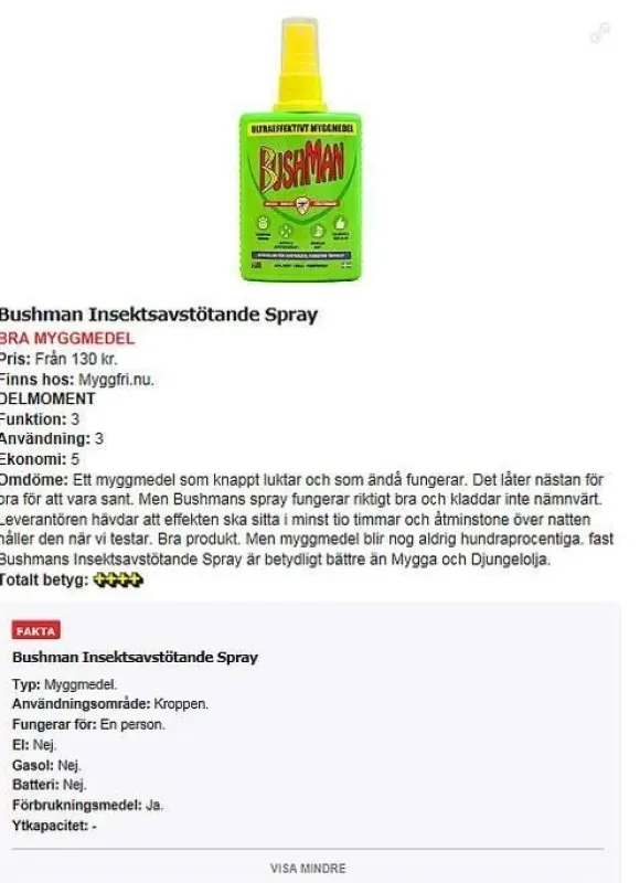 Bli myggfri med Bushman pumpspray och njut av den svenska sommaren. (Se testet i Aftonbladet som inlagd bild). Bushman pumpspray är skonsam mot huden och innehåller allergifta ingrediens. Bushman har en behaglig doft, är vatten och svett-resistent och kladdfri. Bushman myggspray ger ett långvarigt skydd mot insekter som mygg, knott, fästingar, flugor och andra luftburna insekter, i upp till 15 timmar.