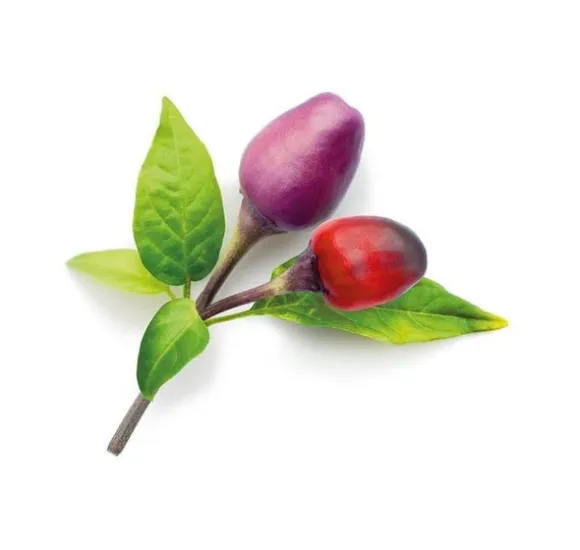 Lila chili har mycket attraktiva vita blommor med lila kanter. Dess frukter mognar från levande lila till klarröda. Färsk chilipeppar, röd, lila eller grön, är en rik källa till C-vitamin. Chilis är också bra källor till antioxidanter som vitamin A och flavonoider som betakaroten, alfakaroten och många fler.