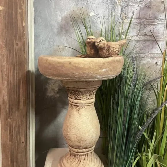 Denna betongvattenkruka är inte bara praktisk utan också ett elegant tillskott till din trädgård. De charmiga sparvarna som sitter på vattenkrukan ger en naturlig atmosfär till din trädgård. Betongpelaren säkerställer hållbarhet och stabilitet, vilket innebär att du kan njuta av den vackra utsikten under många säsonger framöver.