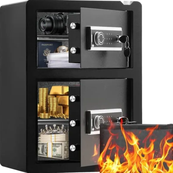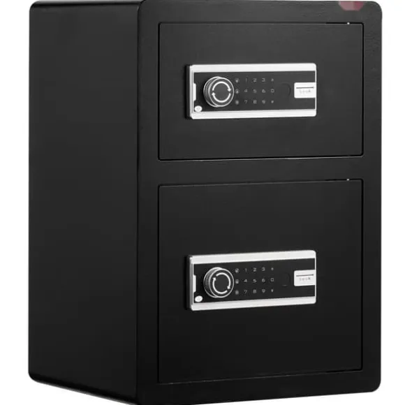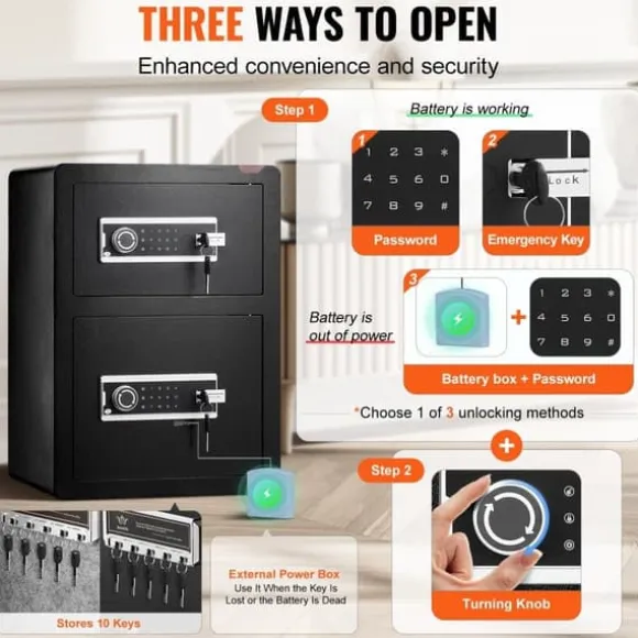 Vårt kassaskåp och låsbox erbjuder 3 upplåsningsmetoder: med en nyckel eller en 3-12-siffrig kod. Dessutom, om du tappar nyckeln och låsets batteri är urladdat, kan du fortfarande använda ett externt batteri för att driva låset och komma åt kassaskåpet med lösenordet.