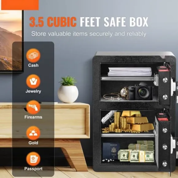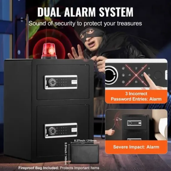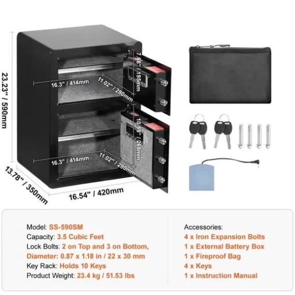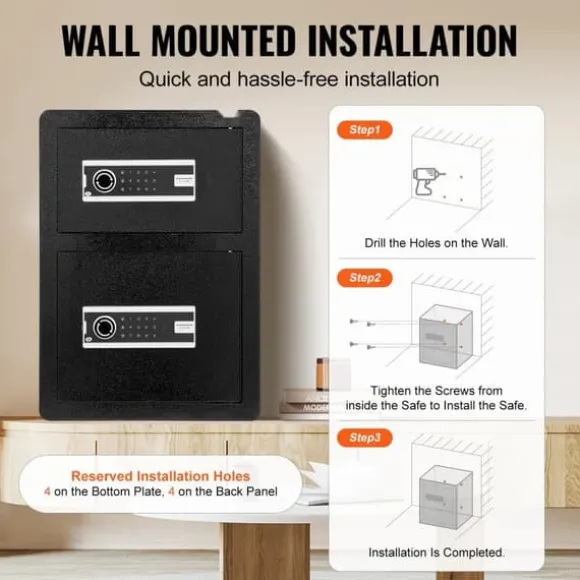 Det säkra valvet innehåller 4 förborrade hål på baksidan och botten, tillsammans med fyra expansionsskruvar, så att du säkert kan montera det på en vägg, golv eller hylla. Dess stora kapacitet är perfekt för att organisera kontanter, pass, smycken, guld, klockor och dokument. Den kan placeras diskret i lådor, skåp eller garderober i hem, kontor eller hotell.