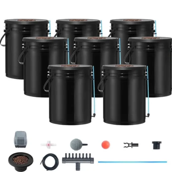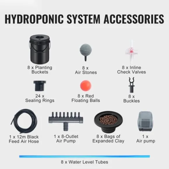 Detta hydroponikodlingssystem inkluderar PP-planteringshinkar, luftpump, luftstenar, tätningslock och ringar, backventiler, svart matarluftslang, påsar med expanderad lera och monteringsinstruktioner, vilket gör installationen mycket bekväm.