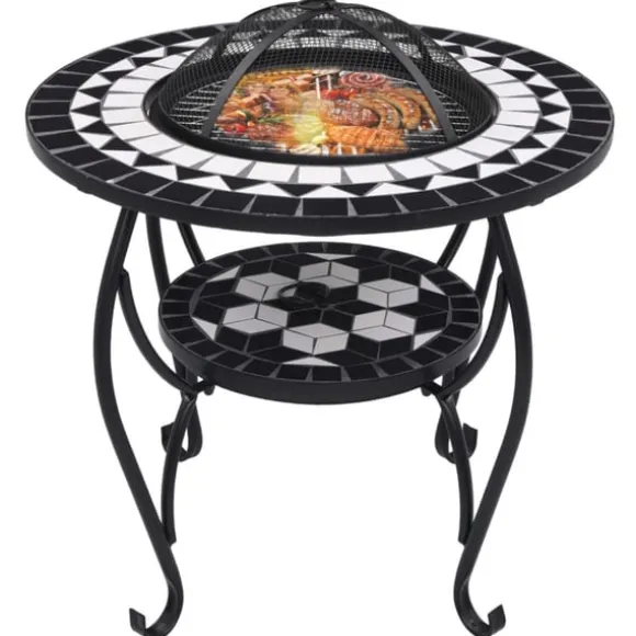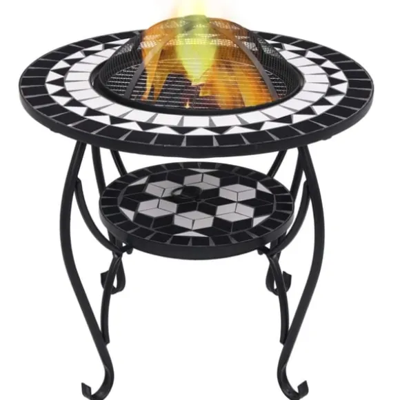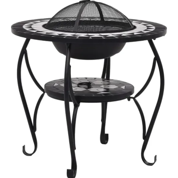 Eldfatet är tillverkad i högkvalitativt stål, och är utmärkt på att absorbera och utstråla värme. Det kan användas för att bränna torrt trä, stockar eller kol. Eldfatet har fyra ben. Det medföljande säkerhetsnätet gör att du kan titta på den brinnande elden, som är omsluten för säkerhet och förhindrar gnistor och skräp som flyger ut. Eldgaffeln kan användas för att både ta bort nätskyddet och ordna om veden eller kolet. Dessutom kan eldstaden också användas som grill. Dess runda keramiska yta erbjuder en perfekt plats för drycker och annat. Observera att denna produkt inte är lämplig att lämnas ute i kallt väder.