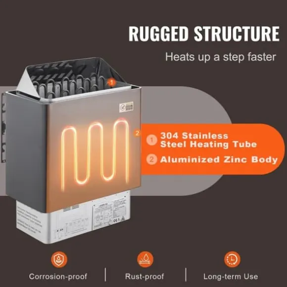 Det aluminiserade zinkskiktet gör bastuugnet hållbart och korrosionsbeständigt, vilket ger långvarig användning även i fuktiga miljöer. Värmeelementen i 304 rostfritt stål ger snabb och jämn värmefördelning för en skön bastuupplevelse.