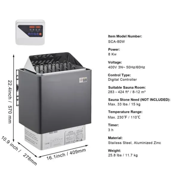 Denna snabbuppvärmningsbastuugn är utformad för att ge dig en bekväm bastuupplevelse på kort tid. Med en effekt på 8KW och passande för basturum på 283-424 ft³ / 8-12 m³, är denna bastuugn perfekt för avkoppling och återhämtning.