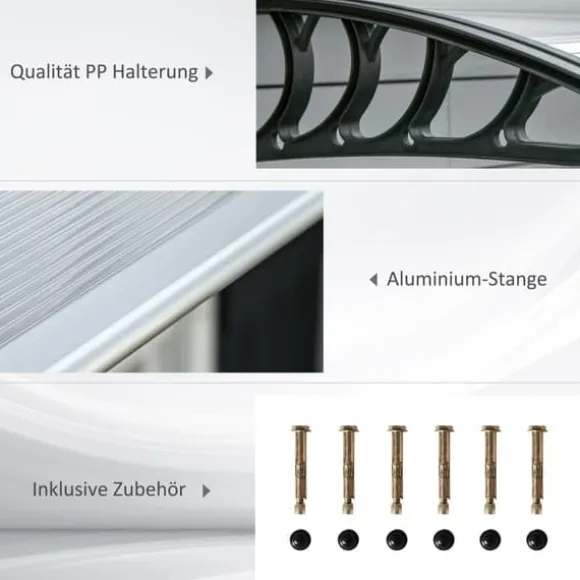 – Utvalda material: Detta dörrtak är tillverkat av 5 mm tjockt, transparent polykarbonat, plastfästen och aluminiumstänger som inte rostar. Det skyddar dina fönster, verandor och ingångar pålitligt mot nederbörd utan att någon särskild skötsel krävs