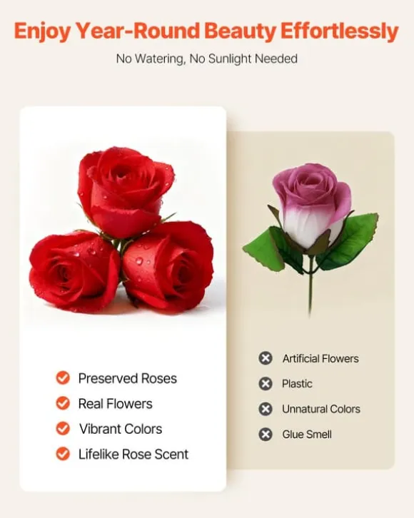 Äkta rosor som varar upp till 3 år Avancerad konservering bevarar rosornas färg, form och mjuka textur länge, så du får ett minnesvärt arrangemang som ser nyplockat ut år efter år.