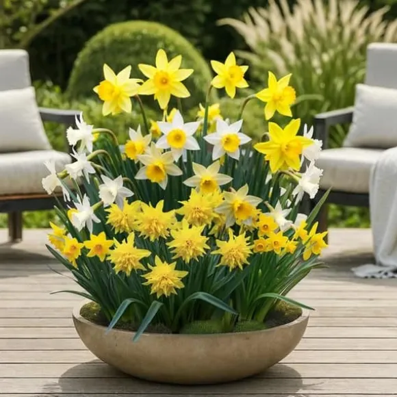 Stor narcissus med färska blommor, i ett strålande vitt.