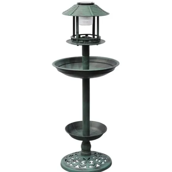 Detta dekorativa fågelbad kommer att bli ett riktigt blickfång i din trädgård, balkong, uteplats etc. Den nedre brickan kan användas för att odla växter eller blommor, och dessa växter förblir torra. Den stora skålen i mitten kan fyllas med vatten så att fåglarna kan bada. Det har en inbyggd solpanel som avger mjukt ljus på natten. Denna attraktiva trädgårdsfunktion blir en härlig detalj i din trädgård.