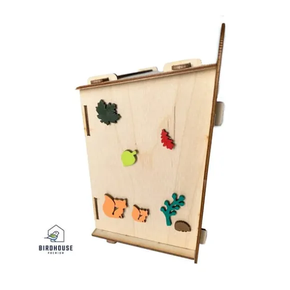 - kit för att dekorera huset – färger (12 färger), penslar (2 st – smal och bred) spets), kanin, räv, igelkott (6 st – rester (träelement) handmålade, mått från 3,5 cm till 1 cm höga), löv och kvistar (8 st – rester (träelement, 1 cm) mått från träelement, 1 cm hög – 2 st, fjäril – 1 st, mörkgrönt bomullssnöre (2 st x 1 m långt)