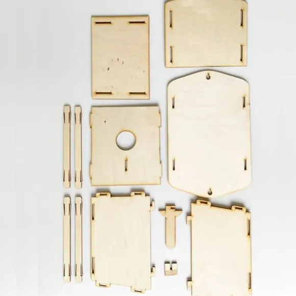 Träelementen i satsen limmas (med trälim) på önskad yta av fågelholken.