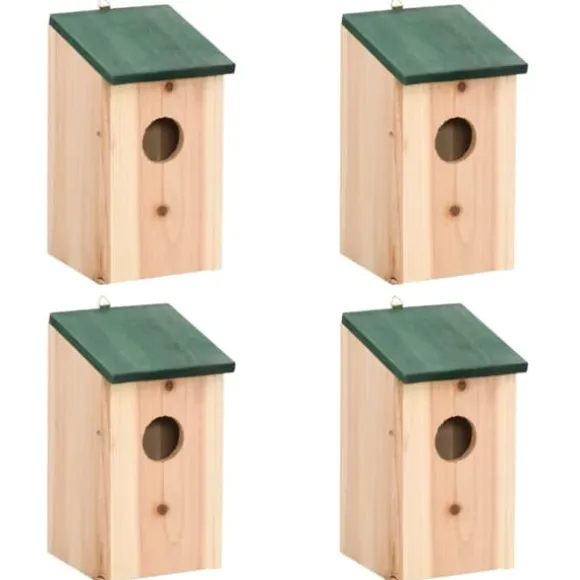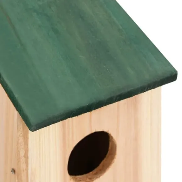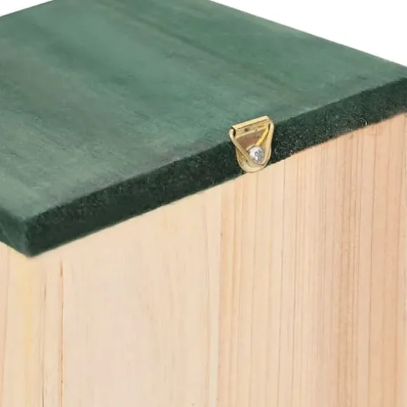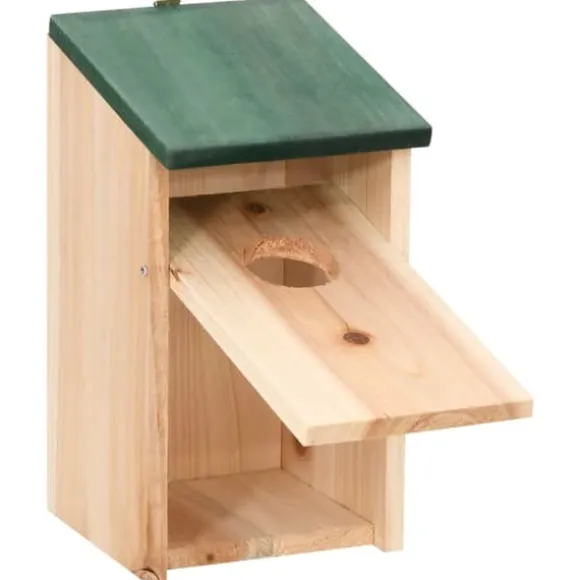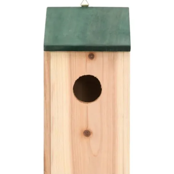 Den levereras med ett grönt tak och hus med träfärg, den blir en vacker dekoration såväl som bostad. Den är utrustad med metallhänge i taket och kan hängas upp i trädgården.