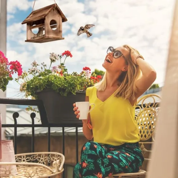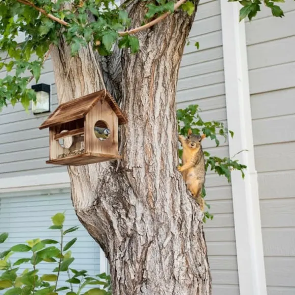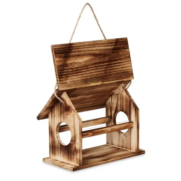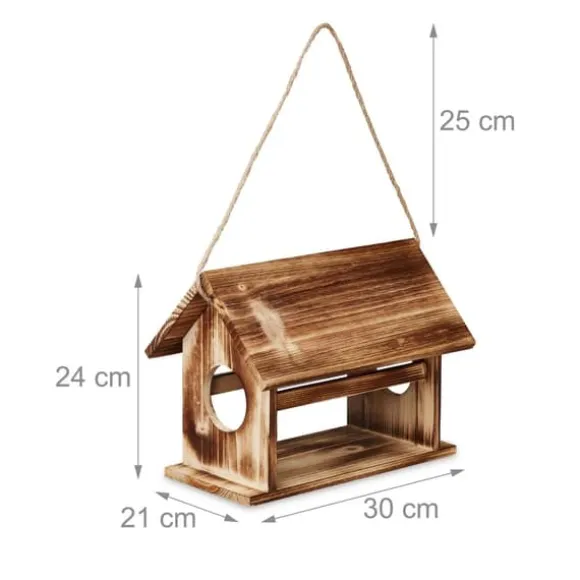 Denna fågelmatare är perfekt för att locka och mata små vilda fåglar i din trädgård, på balkongen eller terrassen. Dess brända träutseende och transparenta matningsbehållare gör den både stilren och praktisk, medan det gångjärnsförsedda taket gör påfyllning enkel. Häng den bara på en gren eller krok och njut av att se fåglar besöka din uteplats.