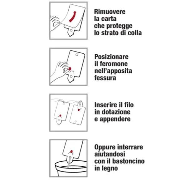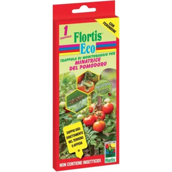 La Tomatogramtraps Flortis är lämplig för övervakning av vuxna motbitar. Den använder en syntetisk kopia av doften som produceras av honan för att locka hanarna till fällan där de fastnar på det limmade stöd. Fångsten av haninsekter minskar sålunda fertiliteten och antalet ägg som läggs. Fällans egenskaper: Förpackningar: 1 gul fälla med två klibbiga sidor, 1 tråd för att hänga den, 1 träpinn för att hjälpa till med insättningen i jorden, 1 feromonlock för fångst utan användning av gifter. Fälla för tomatmätare (Tuta absoluta), vars larver gräver gångar inuti bladen, stammen och mogen frukt som orsakar mögel, ruttnande och förlust av produktens kvalitet. Användningssätt: dubbel användning, hängande: ta bort det silikonbelagda papperet som skyddar limskiktet på båda sidor, placera feromonen i den angivna springan, sätt in tråden i hålet och häng upp fällan. Installerad i jorden: ta bort det silikonbelagda papperet som skyddar limskiktet på båda sidor, placera feromonen i den angivna springan, sätt in fällan i jorden med hjälp av träpinnen som finns i förpackningen efter att ha stuckit den i de två hålen. Det rekommenderas att installera fällorna senast i slutet av april fram till slutet av augusti eftersom motbiten övervintrar i jorden i puppstadiet. De första vuxna fjärilarna kläcks i slutet av vintern, även om flugorna får särskild betydelse först från mitten av juni. Det rekommenderas därför att installera fällorna senast i slutet av april fram till slutet av augusti. En fälla är effektiv för kontroll/övervakning av 3 till 5 träd (inom en radie av 15 meter). Byt ut fällan om den är full av insekter eller efter 6 till 8 veckors användning.