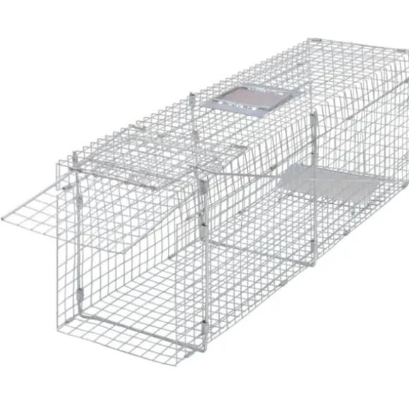 Nätets maskstorlek är liten (2,54 x 2,54 cm), så att flykt och stöld av bete kan förhindras.// Denna levandefångstfälla är tillverkad av ett kraftigt trådnät med en ytterligare förstärkt ram, samt galvaniserat stål för maximalt rostskydd.// Den är utrustad med ett fällbart handtag för bekväm transport både med och utan djur inuti.