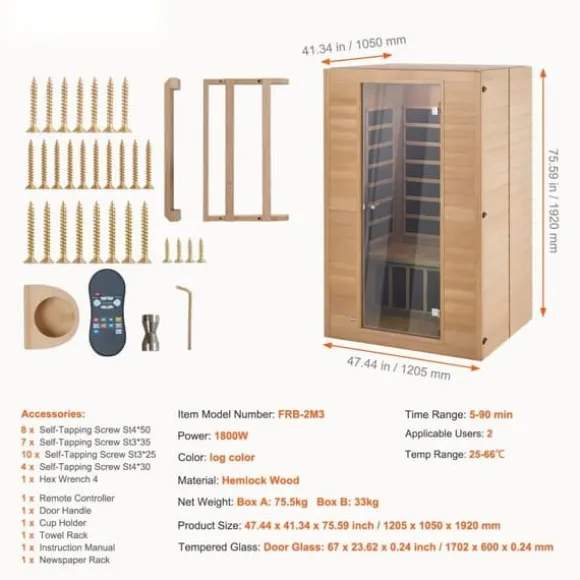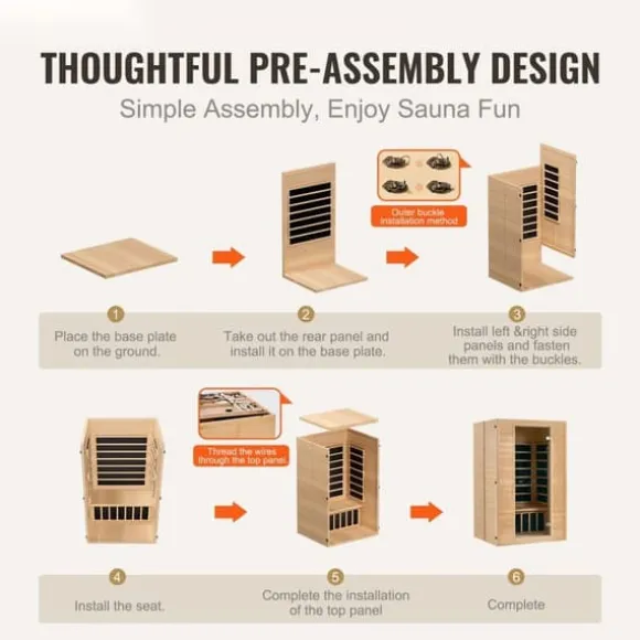 Tillverkade av naturlig kanadensisk hemlock, de 6 mm tjocka panelerna garanterar hållbarhet och en naturlig estetik. Trästrukturen inte bara erbjuder hög kvalitet utan ger också en behaglig bastuupplevelse med en touch av naturlig värme till ditt hem. Njut av musik, belysning, temperaturkontroll och timingfunktioner för att göra din bastuupplevelse roligare. En medföljande klädställning ger en plats att hänga upp dina handdukar och plagg.