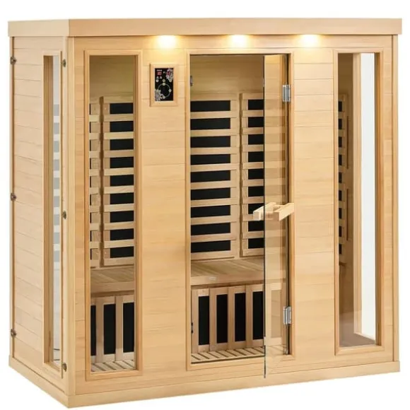6 mm tjocka paneler: Tillverkade av naturlig kanadensisk hemlock, de 6 mm tjocka panelerna garanterar hållbarhet och en naturlig estetik. Trästrukturen uppvisar inte bara hög kvalitet utan erbjuder också en behaglig bastuupplevelse som ger en touch av naturlig värme till din hemmiljö.