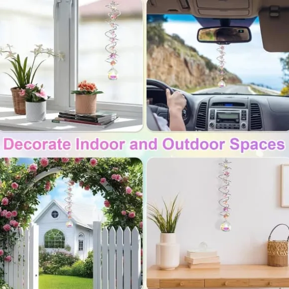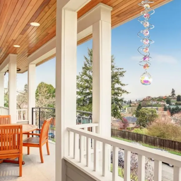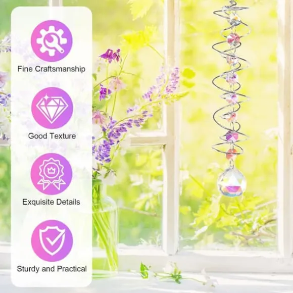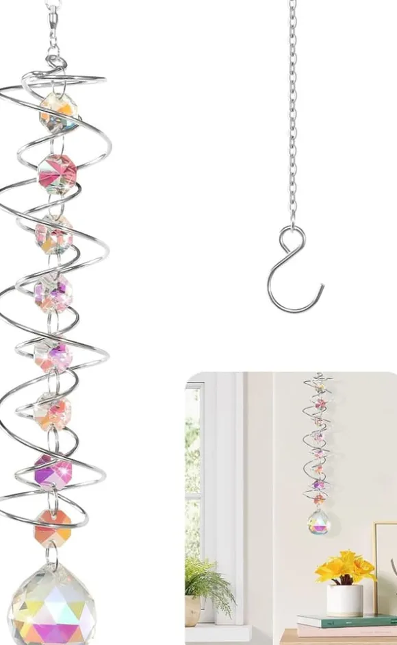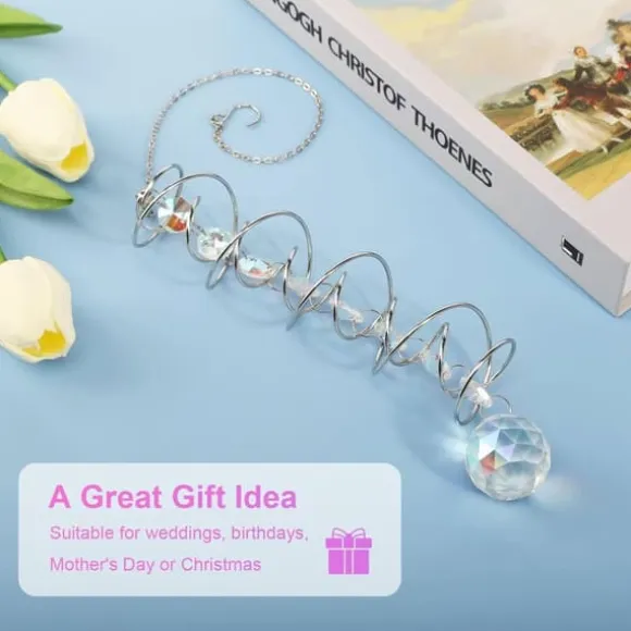 Den dubbla spiralen och glänsande kristallkulan roterar mjukt i vinden, reflekterar ljus och skapar levande regnbågseffekter. Spegeleffekten får kristallen att se ut att sväva medan prismat bryter ljuset till färgglada mönster – en naturlig regnbågsgenerator som skapar fridfull atmosfär.