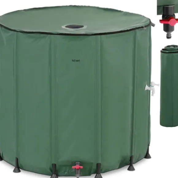 Hillverts regnvattentankhar en stor kapacitet på 1000 l. Den kan användas i hushållet, på fältet, på en camping eller på tomten. Behållaren är lätt att sätta upp, locket är tillverkat av rivsäker PVC och är spänt med plaststavar som säkerställer stabilitet. Det finns ett hål i locket för att dränera ut regnvatten in i det inre. Nätfiltret förhindrar att smuts och löv kommer in. För optimal vattenhantering har behållaren tre avlopp med filter för att hålla vattnet rent. Kranen gör att du kan fylla vattenkanna, avloppskranen i botten har en 3/4″ anslutning, som kan användas till trädgårdsslang. Bräddavloppskranen skyddar tunnan vid kraftigt regn. Materialen som används är hållbara och avsedda för utomhusbruk. Överdrag PVC är tillverkat av 500 D tyg gör att tanken kan vikas ihop för transport eller förvaring.