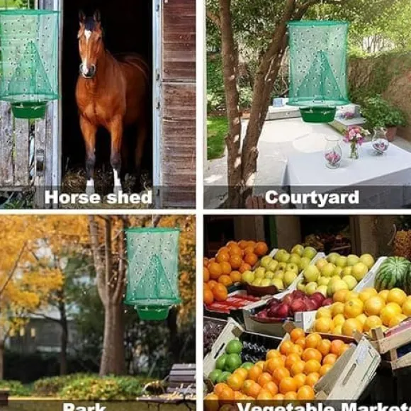 Den återanvändbara och stabila flugfällan är lätt att använda. Häll bara betet i brickan, montera fällan och häng den cirka 1 meter över marken där flugorna samlas. Flugor gillar fiskmat, men du kan också använda andra fiskinälvor, ruttna frukter eller liknande som bete. På våren och hösten rekommenderas att placera fällan på en solig plats utomhus, medan den på sommaren bör hängas i skugga.