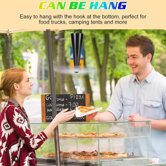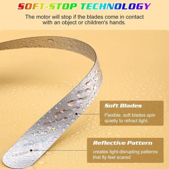 Fläkten använder ljusbrytningsteknik i sina reflekterande blad för att avskräcka flugor och myggor utan kemikalier. De mjuka plastbladen stannar omedelbart vid kontakt – ingen risk för skador till händer eller barn – och återupptar automatiskt rotation när hindret försvinner. Perfekt för att skydda mat på picknickbord eller utomhusrestauranger.