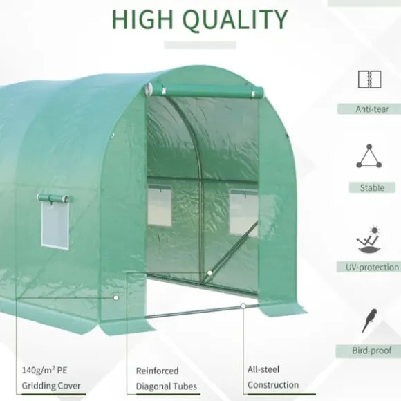 – Högkvalitativ tillverkning: Stativet med rundbågar av pulverlackerade stålrör och extra tvärstänger samt den vattenavvisande folien ger idealisk stabilitet och lång livslängd.