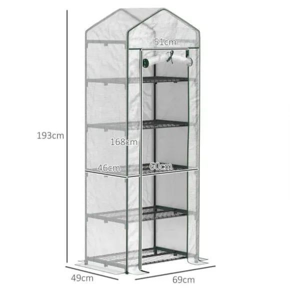 – Produktdata för tomatväxthuset: Totala mått: 69L x 49B x 193H cm; Dörrstorlek: 51B x 168H cm; Plattstorlek: 60L x 46B cm; Höjd på varje nivå: 32 cm; Vikt på varje nivå: 15 kg